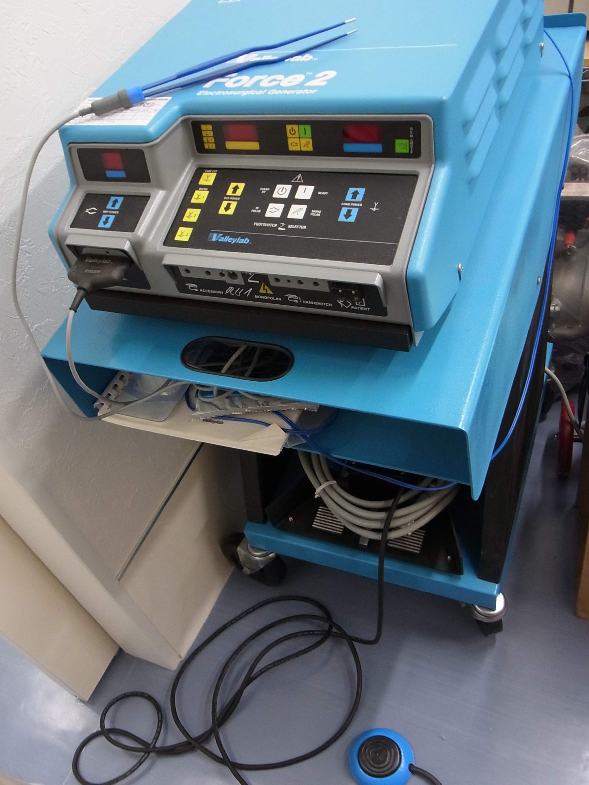 以前から、電気メスは小型のタイプを使用していました。しかし、高出力が必要な症例が出てきたのと、バイポーラ機能が必要になったため、大型高周波電気メスを追加導入致しました。手術室も2つになるので、従来の機器と別々に対応が可能です。通常、モノポーラ電気メス(ペンシル型)では、アースという電気の逃げ道の設置が必要ですが、バイポーラ機能はピンセット型の器具によりアースが必要ありません。それにより、手術の利便性があがりました。