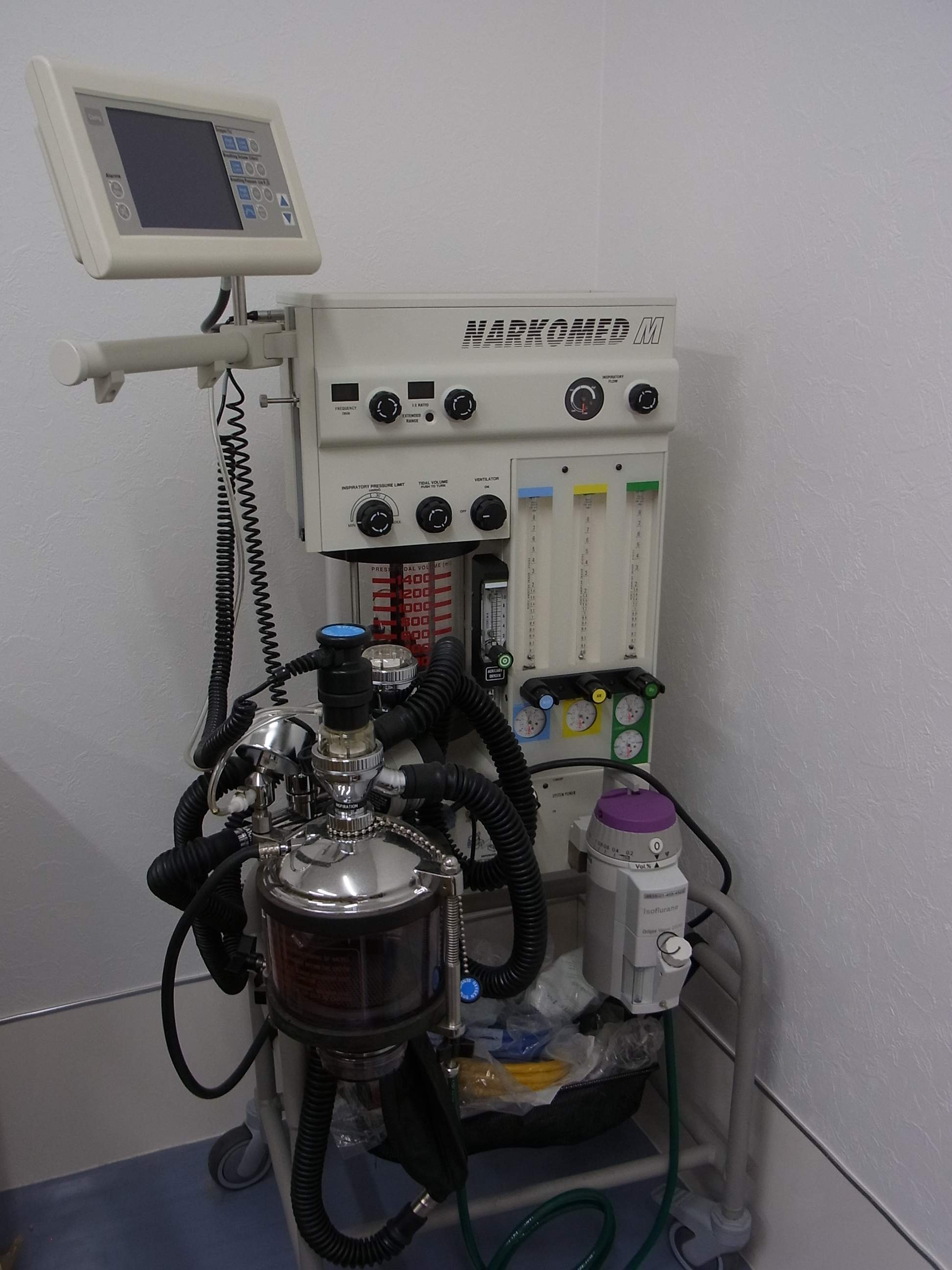 自発呼吸に任せることなく、定期的に人工呼吸をすることにより酸素が安定して供給されます。人医では当たり前ですが、動物 病院にも徐々に普及されてつつあります。当院で実施される腹腔鏡や胸腔鏡を行うに当たり、必須になります。