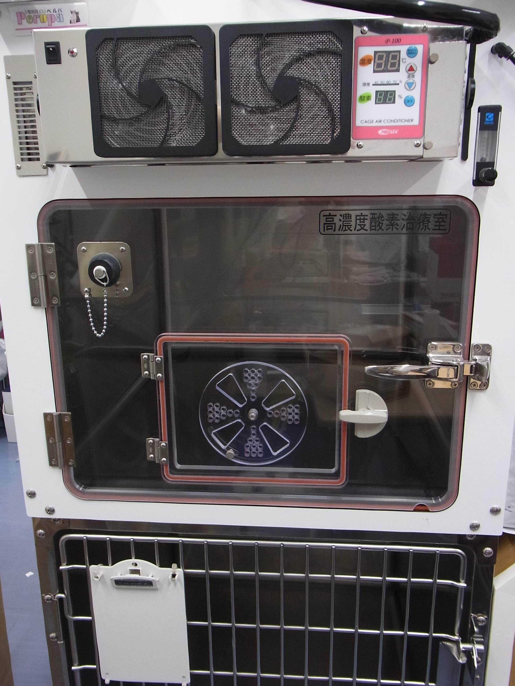 ペットの高齢化に伴い、心疾患症例が増えてきました。通常は、早めに自宅酸素ケージの設置をおすすめしていますが、急性心不全により、肺水腫で入院が必要な場合も想定されるため、小型犬用ではありますが、ICUケージを設置・導入致しました。あくまで、短期間の使用になりますが、急変時には対応させていただきます。