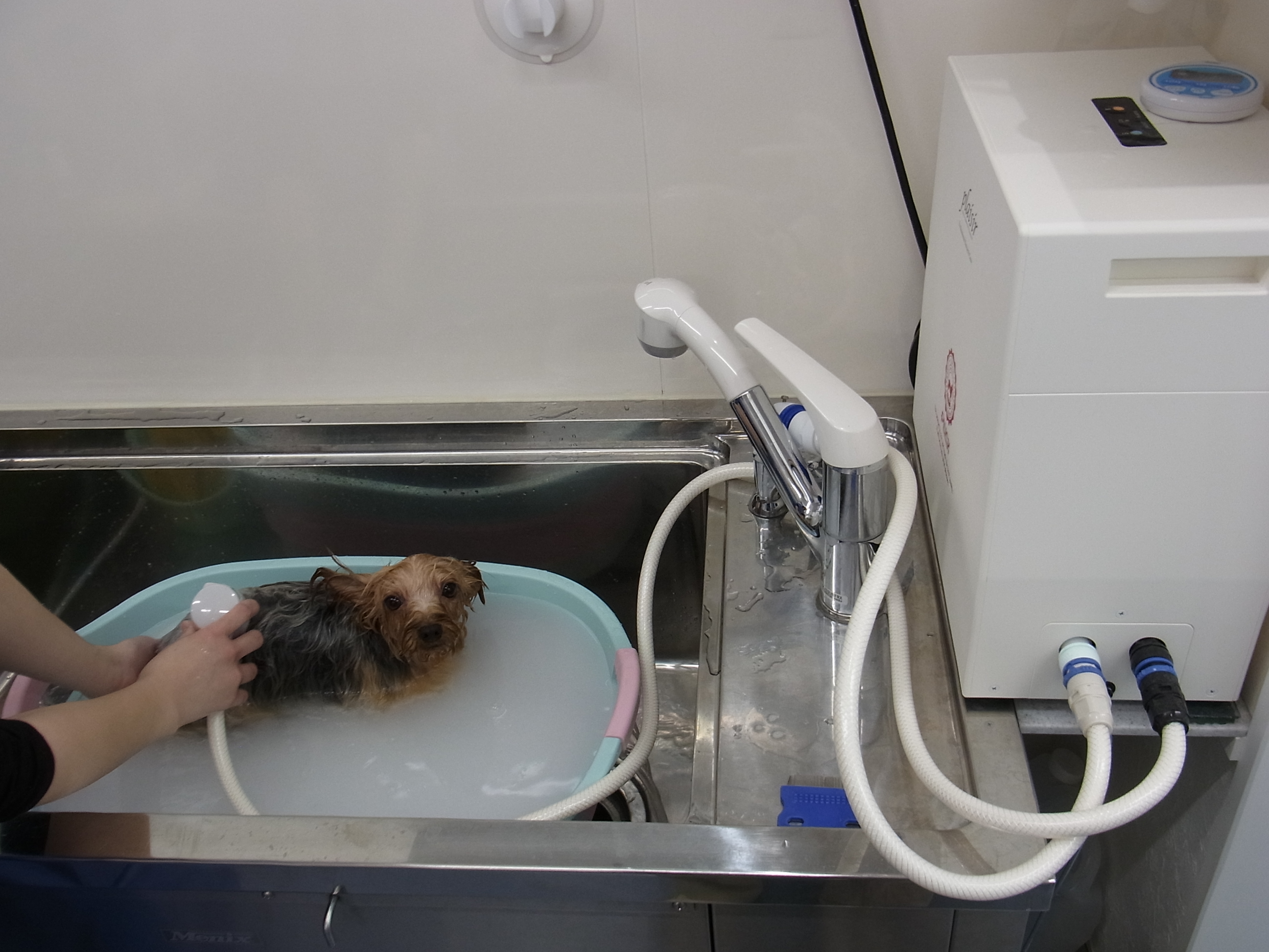 近年、人間と同様に動物も皮膚アレルギー疾患が増えてきました。特に、アトピー性皮膚炎では、薬がやめられない子や療法食でも反応しにくい症例が増えてきました。その対策のひとつに、当院では医療用炭酸泉装置を導入しました。皮膚の代謝を改善してターンオーバーの補助になります。また、毛並みもよくなりつやが出ます。はじめは、週に1回程度からはじめ、3週に1回程度で継続をおすすめします。1カ月くらいすると、実感されると思います。この処置はトリミングの一環になります。ご予約が必要ですので、まずはお電話下さい。