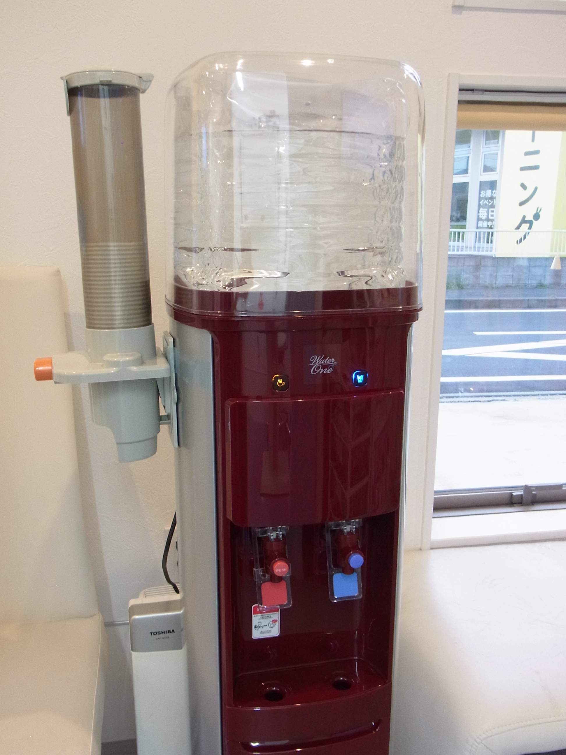 移転時にも新しいサーバーになっていたのですが、1年経過したこの時期に機械の影響で混入物を確認したため、再度新しいサーバーになりました。今回は、ワインレッドで高級感が出ました(笑)。ワンちゃんに飲ませる際は、食器をご用意致します。受付まで。